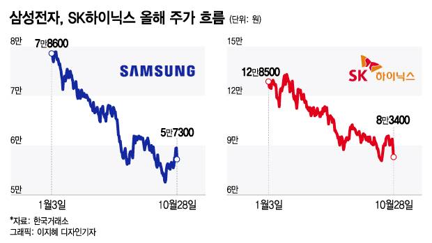 국내 반도체 대장주가 속수무책으로 뚝뚝 떨어졌다. 이번 3분기 실적 급감을 겪은 데 이어 업황 전망이 점점 나빠지면서 투자심리가 위축됐다.