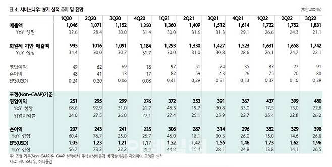 4분기에도 실적 기대감이 높다고 짚었다. 서비스나우는 4분기 회원제 매출액 가이던스가 68.65억~68.70억달러를 기록해 CC 기준 최대 27% 증가할 것으로 봤다. 올해 연간 매출 성장치 역시 28.5%로 종전 대비 0.5%포인트 상향 조정했다. 4분기 조정 OPM은 26%를 예상했으며, 올해 연간 OPM 전망치는 연초에 제시한 25%를 유지했다. 김 연구원은 “연초 이후 진행될 달러 강세 속도와 그에 따른 탑라인 영향을 고려하면 수익성 전망치를 그대로 유지하고 있다는 점은 고무적”이라고 평가했다.