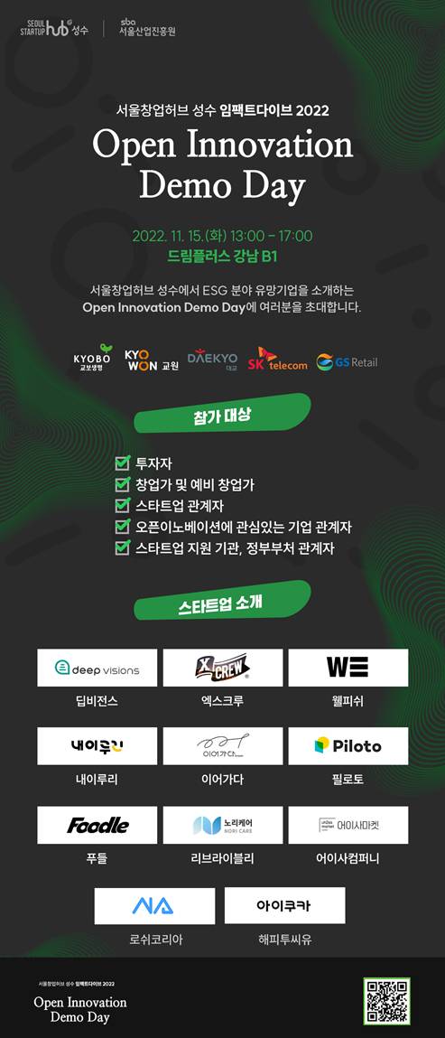 이번 데모데이에는 투자자, 액셀러레이터뿐만 아니라 예비창업자를 비롯한 스타트업, 오픈 이노베이션에 관심 있는 기업 관계자, 창업 지원기관 및 정부 부처 관계자가 모두 참여할 수 있다. 사전 이벤트 및 데모데이 행사에 참가하려면 행사 포스터 상의 QR코드 인식을 통해 간단하게 할 수 있다.