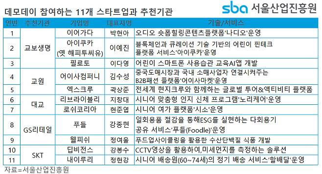데모데이에 참여하는 11개 스타트업은 △내이루리 △딥비전스 △로쉬코리아 △리브라이블리 △아이사컴퍼니 △아이쿠카(옛 해피투씨유) △엑스크루 △웰피쉬 △이어가다 △푸들 △필로토이다.