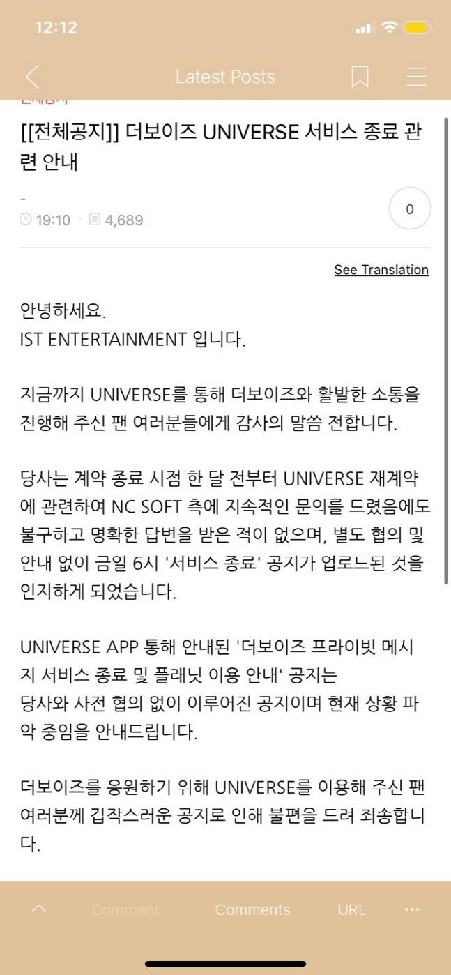 IST 측은 “유니버스 앱을 통해 안내된 더보이즈 프라이빗 메시지 서비스 종료 및 플래닛 이용 안내 공지는 당사와 사전 협의 없이 이루어진 공지이며 현재 상황 파악 중이다”라고 전했다.