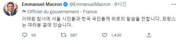 아시아와 남미 정상들도 위로를 전했다. 존 리 홍콩 행정장관은 “유가족에 깊은 애도를 표하며 부상한 모든 이들의 빠른 회복을 기원한다”고 페이스북에 썼다. 안드레스 마누엘 로페스 오브라도르 멕시코 대통령은 공식 트위터를 통해 “한국 국민과 정부에 마음 깊이 연대의 뜻을 보낸다”고 밝혔다.