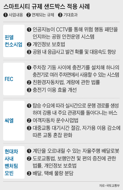윤석열 정부가 스마트시티 관련 기업 육성을 위해 운영하는 규제 샌드박스가 혁신 기술의 사업화 플랫폼으로 자리 매김하고 있다. 규제 샌드박스는 기업들이 제한된 시장에서 규제 없이 최대 6년간 사업을 하면서 성공 가능성을 높이도록 돕는 제도다. 국토부는 참여 기업에 최대 5억원의 실증 사업비도 지원한다.