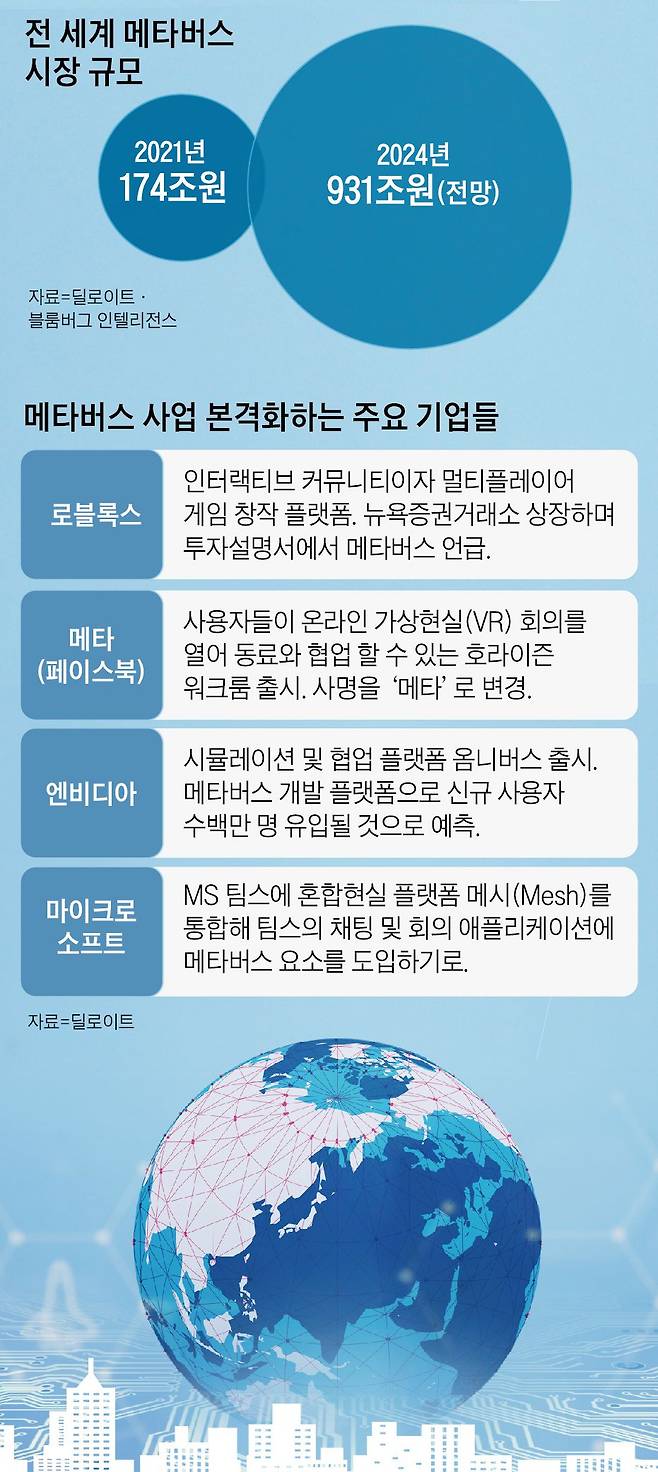 시장 성장 가능성을 보는 전문가들의 견해도 ‘눈부신 성장’을 예고하고 있다. 딜로이트는 메타버스 시장 규모를 작년 174조원에서 2025년 427조원으로 예상하고 있으며 블룸버그 인텔리전스 역시 2024년 931조원에 이를 것으로 예측하고 있다. 심지어 모건스탠리와 골드만삭스는 현재의 SNS를 메타버스 플랫폼이 대체하면서 향후 8조달러 이상의 시장이 될 것으로 전망했다. 성장의 플라이휠이 제대로 돌고 있다는 분석이다.