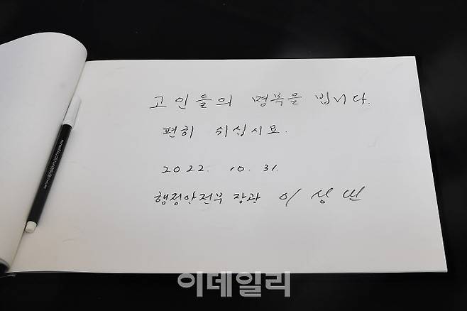 [포토]이상민 행안부 장관이 이태원 사고 사망자 합동분향소에 남긴 방명록
