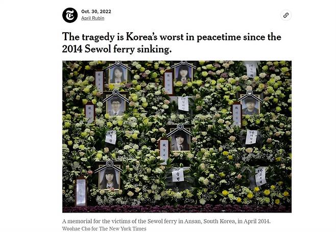 <뉴욕타임스>는 또다른 기사에서 "이태원 참사는 2014년 서해안에서 세월호가 침몰한 이후 한국에서 발생한 최악의 재난"이라고 일갈했다. 그러면서 "이태원 압사 참사에서 사랑하는 이들을 잃은 가족들은 이제 막 답을 찾기 시작했다(a quest that is only just beginning for those families who have lost loved ones in Itaewon.)"고 꼬집었다.