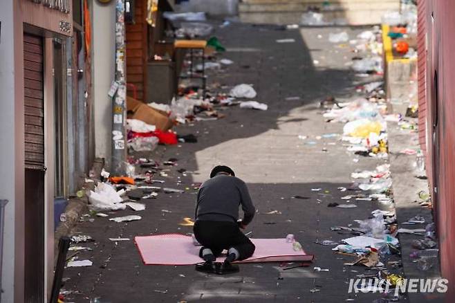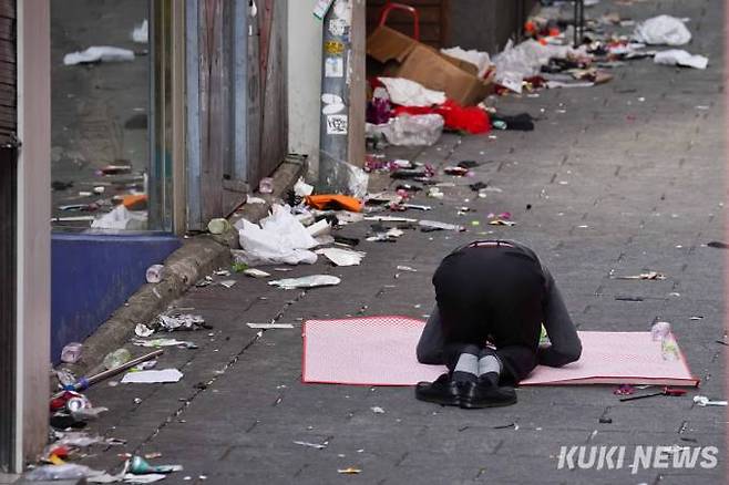 31일 오후 '이태원 압사 사고'가 일어난 서울 용산구 이태원로 거리에서 한 가게 상인이 제사상을 차리고 절을 하고 있다.
