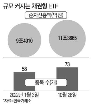 다만 전문가들은 금리 인상 기조가 언제까지 이어질지 예단하기 쉽지 않은 만큼 투자에 주의가 필요하다고 강조한다. 31일 한국거래소에 따르면 국내 상장 채권형 ETF 순자산총액은 연초에 비해 1조8755억원 늘어 11조3665억원까지 증가했다. 채권 가격과 금리는 서로 반대로 움직인다.