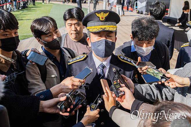 | ▲ 윤희근 경찰청장이 31일 오전 서울시청 앞 '이태원 사고 사망자 합동분향소'에서 조문을 마치고 기자들의 질문에 답변하고 있다. |