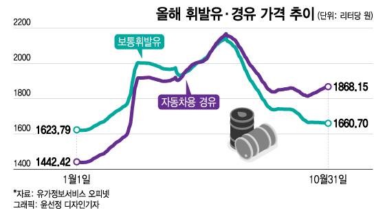 전국 주유소 평균 ℓ당 경유 가격은 지난 10월 7일(1814원)부터 지속 오름세를 보이며 50원 이상 뛰었지만, 휘발유 리터당 가격은 이달 초 1680원대에서 등락을 거듭하며 20원 가까이 떨어졌다.
