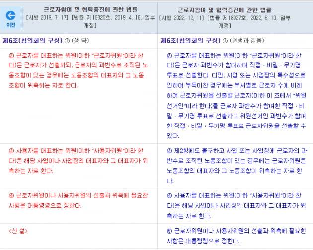 이에 따라 △노사협의회의 근로자위원 선출 시 근로자 과반수 참여 △선출 과정에서 직접·비밀·무기명 투표 원칙을 명시하는 등의 내용을 담은 개정 근참법이 지난 6월 통과돼 12월 11일 시행을 앞두고 있다.