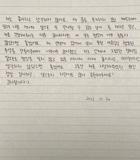 갑작스러운 소식에 많이 놀라셨죠… 팬분들께 어떻게 말을 전해야 할까 계속해서 고민하다가 이렇게 편지로라도 제 마음을 전해 보려고 해요.