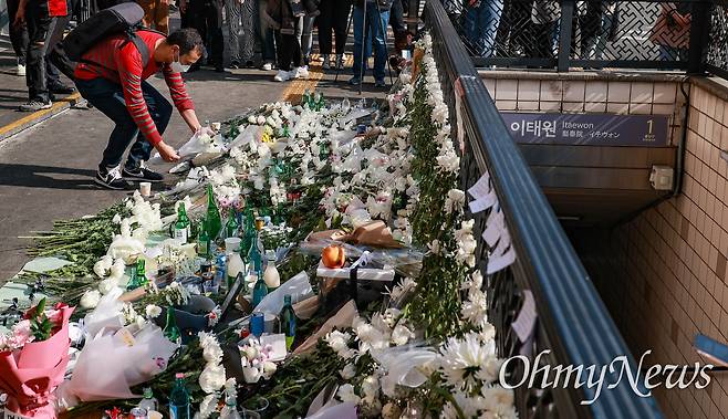 | ▲ 31일 오후 서울 용산구 이태원역 1번 출구앞에 마련된 이태원 압사 참사 희생자 추모공간에서 내외국인들이 희생자들을 추모하고 있다. |