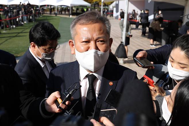 | ▲ 이상민 행정안전부 장관이 10월 31일 서울 중구 서울광장에 마련된 이태원 참사 합동분향소에서 참배를 마친 취재진의 질문에 답변하고 있다. |