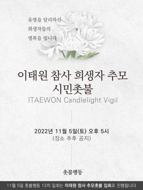 촛불집회 유튜브 채널 '촛불전진'에도 "안타까운 마음을 담아 11월 5일로 예정됐던 촛불행동 13차 집회를 '이태원 참사 추모 촛불 집회'로 진행한다"며 "연대와 추모의 마음을 모아주시길 바란다"고 밝혔다.