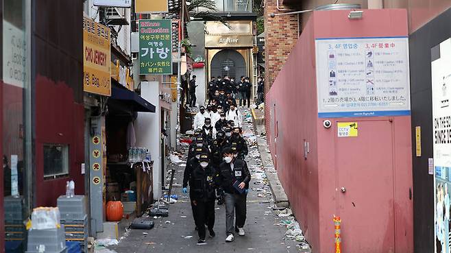 대규모 압사 참사가 벌어진 내리막 골목길로 이어지는 'T'자형 통로의 오른쪽 윗부분 모퉁입니다.