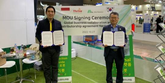 힐스로보틱스는 지난 10월 26일부터 29일까지 한국에서 열린 '로봇월드2022'에서 인도네시아 로봇회사 '트라이브(Thrive)'와 MOU를 맺었다.