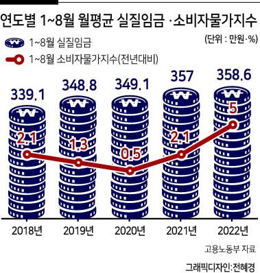 하지만 이는 ‘허상’이다. 물가를 반영한 8월 실질임금은 340만8000원으로 지난해 같은 기간보다 1만9000원(0.6%) 줄었다. 통장에 찍힌 월급은 18만원 가량 늘었지만 실제 월급은 외려 감소한 셈이다. 지난 7월 6.3%를 기록한 소비자물가 상승률은 8월(5.7%), 9월(5.6%)에 이어 10월에도 5.7%를 기록하면서 세 달 연속 5%를 기록하고 있다.
