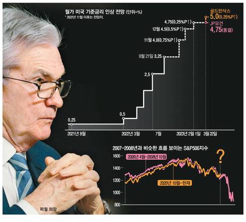 FOMC를 코앞에 둔 상황에서 골드만삭스, JP모건 등 대형 투자은행(IB)은 일단 낙관론에 힘을 싣고 있다. 내년에 미국 기준금리가 4.75~5%에서 정점을 찍고 끝날 것이라는 예상이다.