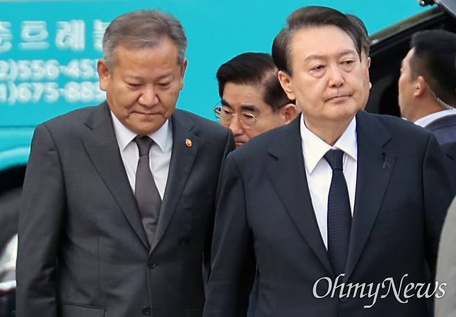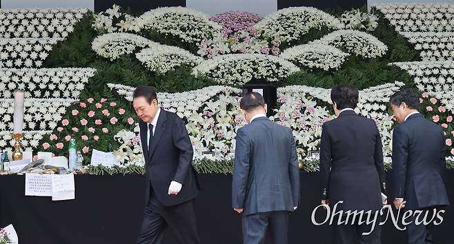 | ▲ 윤석열 대통령과 이상민 행정안전부장관 등 참모들이 3일 오전 중구 서울광장에 마련된 ‘이태원 사고 사망자 합동분향소’를 찾아 조문하고 있다. |