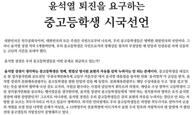 <윤석열 퇴진을 요구하는 중고등학생 시국선언>