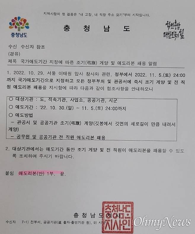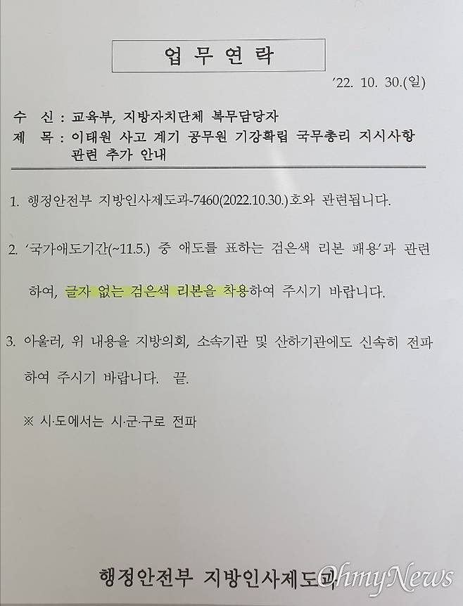 사진은 <오마이뉴스> 가 입수한 '이태원 사고 사망자' 표기 공문과 '근조 글귀 없는 검은 리본' 사용 관련 공문이다. 오마이뉴스>