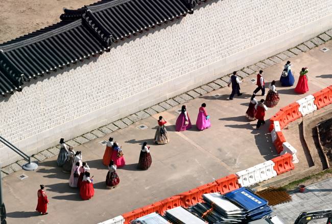 알록달록 한복을 차려입은 시민들이 경복궁 돌담길을 걸어갑니다.