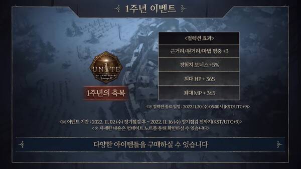 리니지W 1주년과 신규 영지 오렌 업데이트를 맞이해 오는 16일까지 1주년의 축복을 제공한다. 1주년의 축복은 근거리·원거리·마법 명중 +3, 경험치 보너스 +5%, 최대 HP·MP +365가 상승하는 효과를 제공한다.