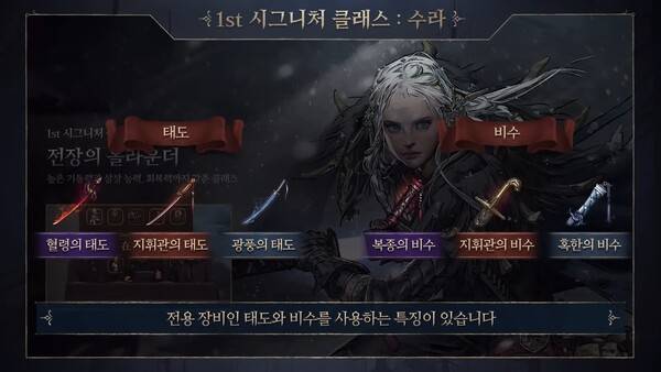 1주년 업데이트에서 가장 이목을 끈 콘텐츠는 최초의 시그니처 클래스 '수라'다. 전장의 올라운더라고 소개된 수라는 목표한 적을 반드시 처단하는 마물 사냥꾼으로 높은 기동력과 살상 능력 그리고 회복력이 큰 장점이다. 전용 장비는 태도와 비수다.