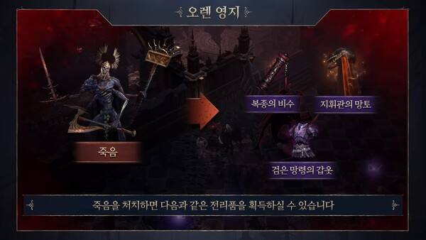 또한 오렌 영지에는 차원의 균열로 등장한 마족들이 지배한 월드 던전 '상아탑'이 존재한다. 상아탑의 야히 진형에는 야히의 강력한 부하들이 포진되어 있다. 상아탑 야히 진영 5층에는 수문장 '죽음'이 있다. 죽음은 상아탑 봉인 후에도 인간계에 남아 도전자를 기다리고 있었던 것이다. 죽음을 처치하면 '복종의 비수', '지휘관의 망토', '검은 망령의 갑옷'이 드랍된다.