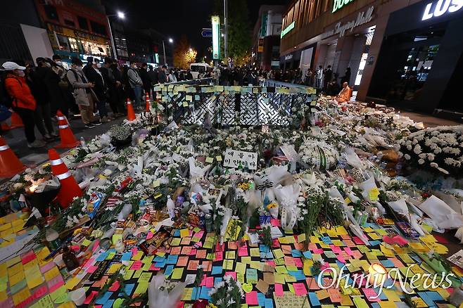 | ▲ 2일 오후 서울 용산구 이태원 압사 참사 현장 부근인 이태원역 1번 출구에 희생자들을 추모하며 시민들이 가져다 놓은 국화꽃, 메모지, 술병, 촛불 등이 가득하게 쌓여 있다. |