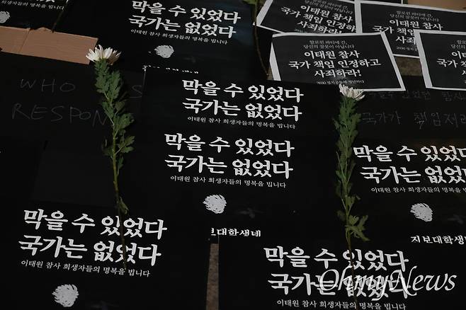 | ▲ 2일 오후 서울 용산구 이태원 압사 참사 현장인 골목길 입구에 ‘이태원 참사 청년 추모행동’ 참가자들이 가져온 국화꽃과 ‘막을 수 있었다. 국가는 없었다’ 등이 적힌 피켓이 놓여 있다. 추모행동에는 청년진보당, 청년정의당, 청년녹색당, 노동당 학생위원회, 페미니즘당 창당준비모임 청년하다, 청년연대, 진보대학생네트워크 회원들이 참석했다. |