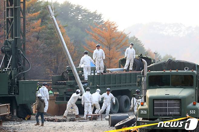 (봉화=뉴스1) 공정식 기자 = 3일 오후 경북 봉화군 아연광산 매몰 사고 현장에서 군 관계자들이 고립 작업자들의 생존 여부를 확인하기 위해 시추작업을 진행하고 있다. 2022.11.3/뉴스1