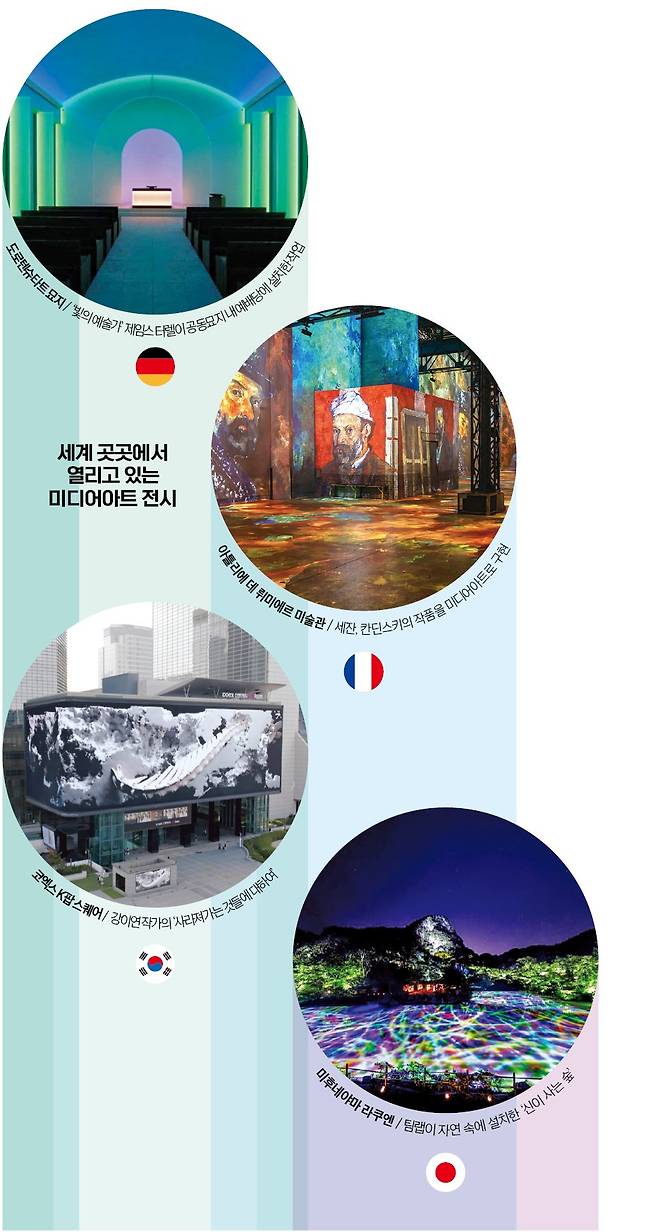 미디어아트의 힘은 ‘작품을 살아 움직이게 하는 것’에서 나온다. 구스타프 클림트의 ‘아델르 블로흐-바우어의 초상’은 가로·세로 1.3m의 캔버스를 뚫고 나와 거대한 전시장 안에서 관람객과 마주하고, 바실리 칸딘스키의 조형적 요소들은 마치 우주를 유영하는 우주선처럼 유유히 흐른다.