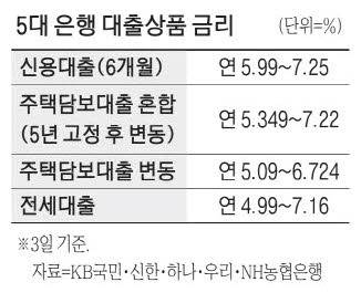 3일 금융권에 따르면 5대 은행의 대표 대출상품 금리는 주택담보부터 전세, 신용대출까지 종류에 상관없이 상단이 연 7%를 넘는다. 하지만 이 같은 수준은 이번 미국 연방공개시장위원회(FOMC)의 금리 인상 효과가 아직 반영되지 않은 금리다.