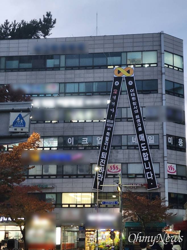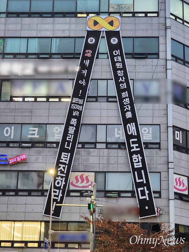 건물 네 개 층을 가릴 정도로 크고 긴 펼침막 오른쪽에는 "이태원 참사의 희생자를 애도합니다", 왼쪽에는 윤석열 정부의 참사 책임을 물으며 퇴진을 주장하는 문구가 담겼다.