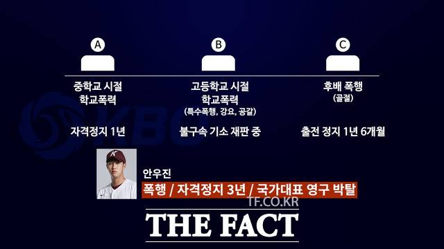 [더팩트ㅣ이효균·배정한·윤웅 기자] 1편에서 안우진 '학폭'과 관련된 2017년도의 징계 과정을 보도해 드렸는데요, '학폭'으로 인해 징계를 받은 선수들의 사례를 보면 안우진의 경우와 확연히 차이가 납니다.