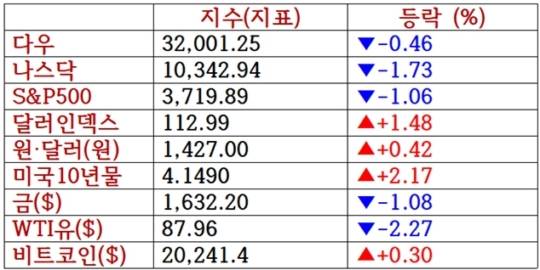 뉴욕증권거래소(NYSE)에서 다우존스30산업평균지수는 전장보다 146.51포인트(0.46%) 하락한 32,001.25로 거래를 마쳤다. 스탠더드앤드푸어스(S&P)500지수는 전거래일대비 39.80포인트(1.06%) 밀린 3,719.89로, 기술주 중심의 나스닥 지수는 전날보다 181.86포인트(1.73%) 떨어진 10,342.94로 장을 마감했다.