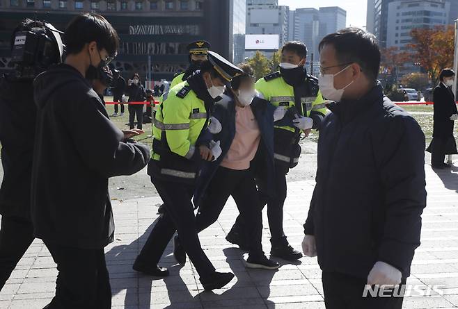 [서울=뉴시스] 고승민 기자 = 4일 서울광장에 마련된 이태원 사고 희생자 합동분향소에서 한 유족이 윤석열 대통령과 관계자들의 근조화환을 내동댕이치고 대통령과 행안부 장관의 사죄를 촉구하며 분노하다 경찰에 의해 끌려 나가고 있다. 2022.11.04. kkssmm99@newsis.com