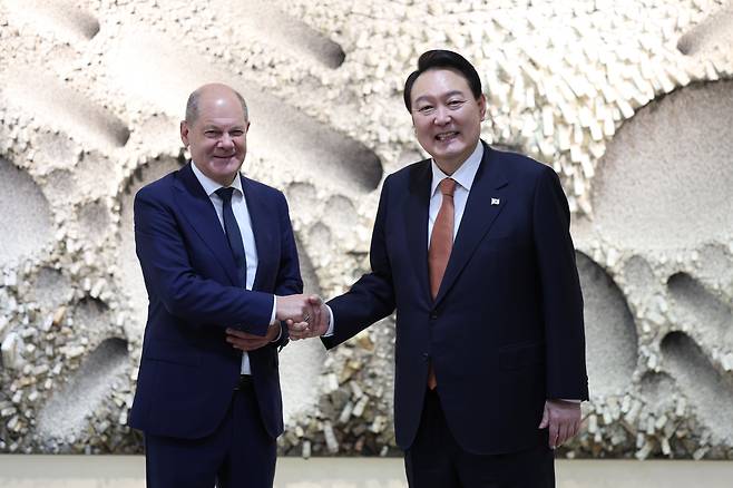 | ▲ 윤석열 대통령과 올라프 숄츠 독일 총리가 지난 9월 21일(현지시간) 뉴욕 주 유엔 대한민국 대표부에서 열린 한독 정상회담에 앞서 기념 촬영을 하고 있다. |