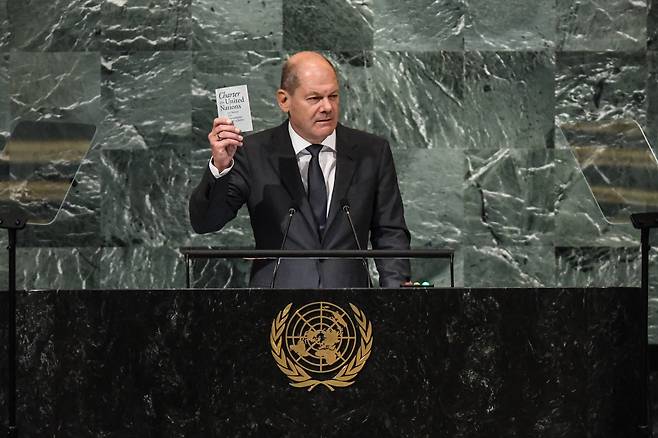 | ▲ 올라프 숄츠 독일 총리가 지난 9월 20일(현지시간) 미국 뉴욕 유엔본부에서 열린 제77차 유엔총회 일반토의에서 연설하는 모습. |