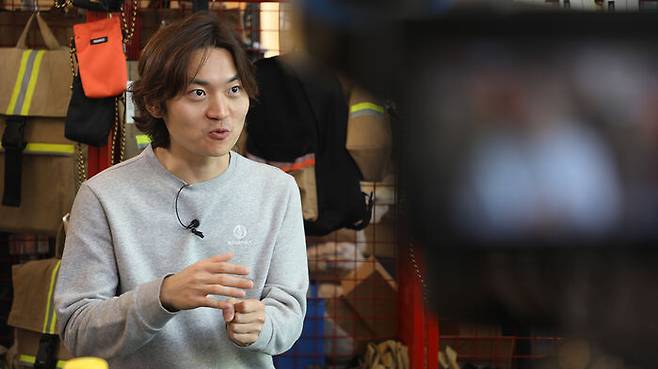 "업사이클링이라는 것 자체가 환경 운동의 선봉장 같은 역할을 하다 보니까 점점 더 많은 생각을 하는 것 같고 이 제품을 만들면서 CO2를 우리가 얼마나 감축시킬 수 있냐 이런 것들도 고민을 많이 하거든요. 사실 감축보다는 정확한 표현을 쓰자면 억제시키는 거죠. 그러니까 (방화복 소재인) 아라미드가 그냥 폐기되면 자기 무게의 한 2.5에서 2.6배 정도의 이산화탄소를 방출하면서 타게 되는데 그러면 그만큼을 이제 늦게 소각될 수 있게 만들어주는 거죠."
