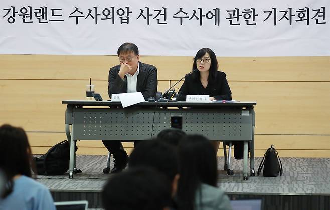| ▲ 2018년 5월 15일, 강원랜드 채용비리 수사에 외압이 있었다고 폭로한 안미현 당시 의정부지검 검사(오른쪽)가 서울 서초구 변호사 교육문화회관에서 기자회견을 열고 문무일 현 검찰총장 역시 수사에 외압을 행사한 의혹이 있다며 진상 규명을 요구하고 있다. |