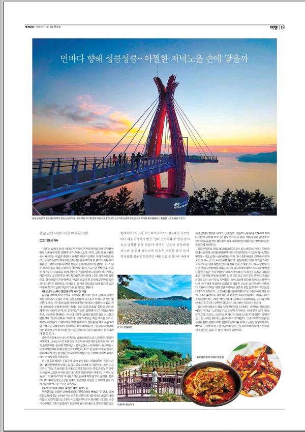 바다 즐기며 걷는 ‘남해 바래길 ’ 본선 16개 코스· 지선 4개 코스 240㎞/ 10코스 앵강다숲길에서 다랭이마을 만나/11코스 다랭이지겟길엔 동글납작 선구항 몽돌해변 펼쳐져/남해바래길 8코스 섬노래길 설리스카이워크 환상 노을 잊을 수 없는 추억