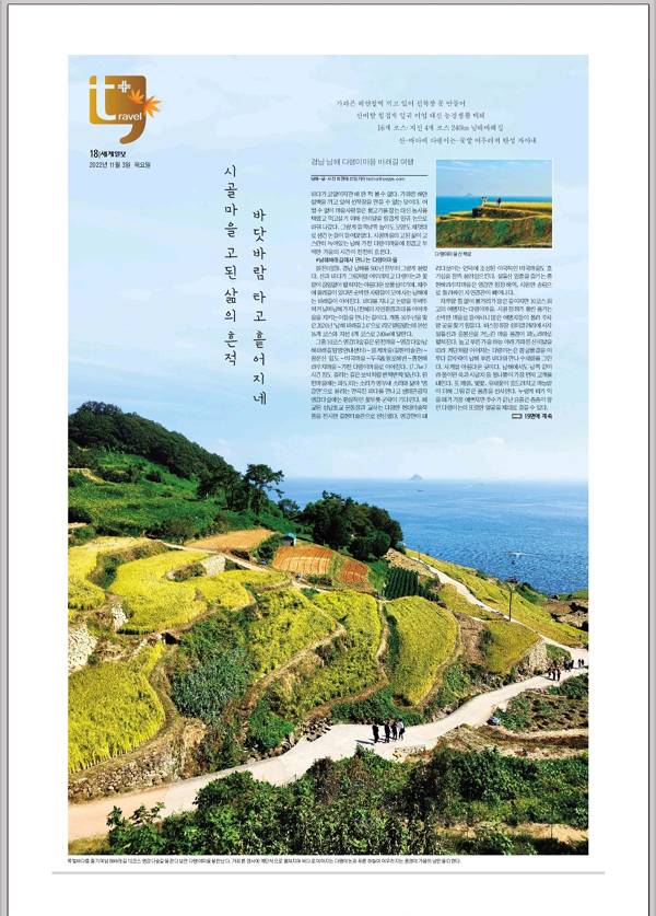 화전(花田). 경남 남해를 500년 전부터 그렇게 불렀다. 산과 바다가 그림처럼 어우러지고 다랭이논과 꽃밭이 끊임없이 펼쳐지는 아름다운 보물섬이기에. 제주에 올레길이 있다면 순박한 사람들이 모여 사는 남해에는 바래길이 이어진다. 바다를 지나고 논밭을 뚜벅뚜벅 거닐며 남해가 지닌 천혜의 자연환경과 대를 이어 마을을 지키는 이들을 만나는 길이다. 개통 10주년을 맞은 2020년 ‘남해 바래길 2.0’으로 리모델링됐는데 본선 16개 코스와 지선 4개 코스로 240㎞에 달한다.