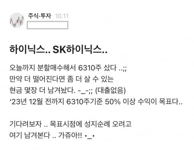 이 개미는 한 달 전 SK하이닉스 주식 6310주를 매수하고 익명 커뮤니티에 인증글을 남겼습니다.