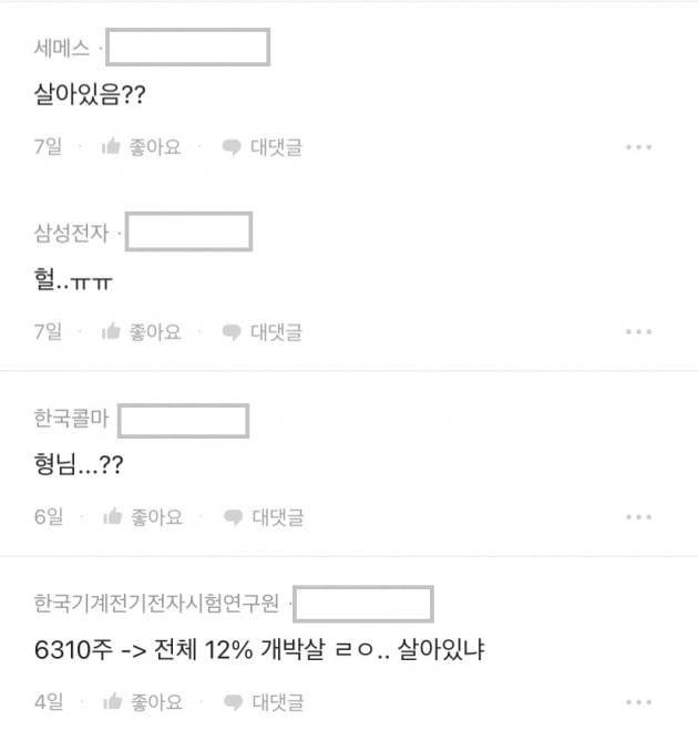 직장인 익명 커뮤니티에서는 근황을 묻는 글이 올라오고 있습니다. 왕개미의 몰빵 스토리를 기억하는 직장인들의 성지순례가 이어지고 있는 것입니다. 한 직장인은 “주가가 급락했는데 살아는 있느냐”며 안부를 물었습니다.