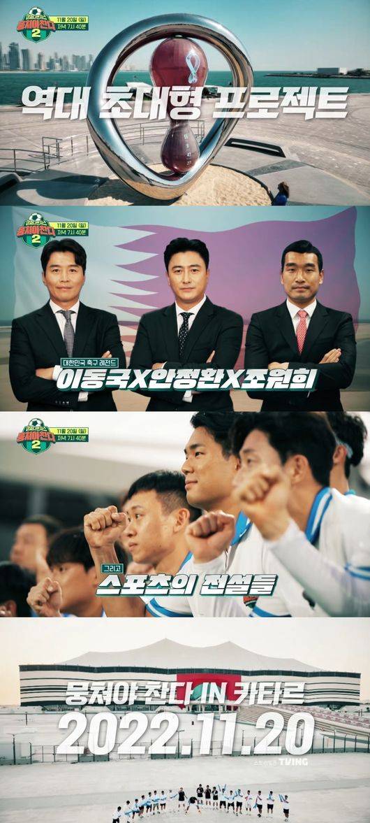 6일 JTBC 예능 프로그램 ‘뭉쳐야 찬다 2’ 측은 티저 영상을 공개했다. 월드컵 사상 최초로 중동 국가에서 개최되는 2022 카타르 월드컵 개막을 앞두고 ‘어쩌다벤져스’의 카타르 전지훈련을 예고한 것이다.