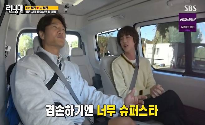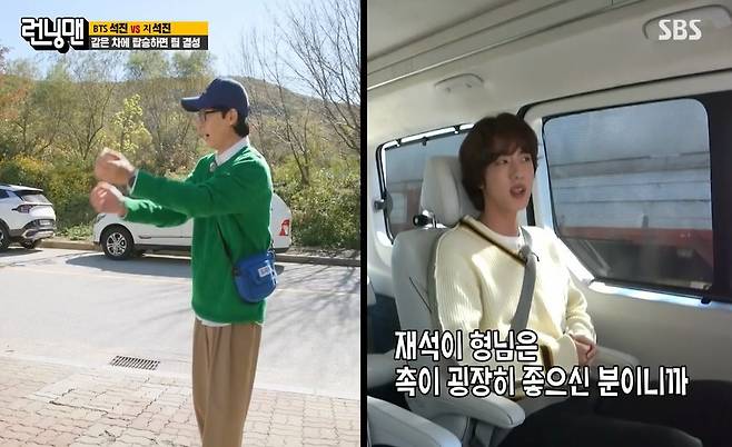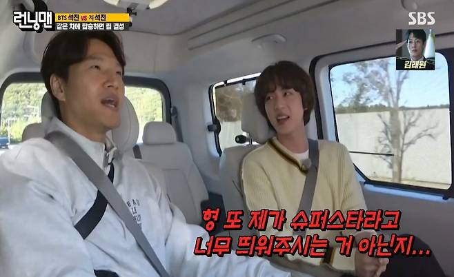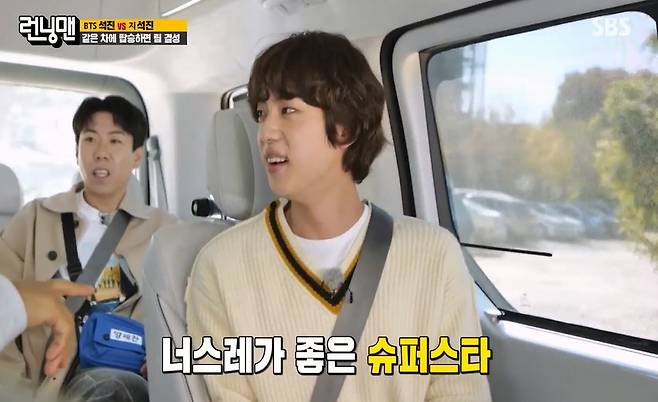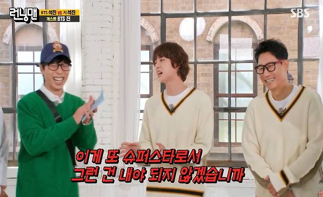 [TV리포트=이혜미 기자] 방탄소년단 진이 ‘런닝맨’에 떴다. 진은 자칭 타칭 슈퍼스타다운 예능감으로 ‘런닝맨’을 쥐락펴락 했다.