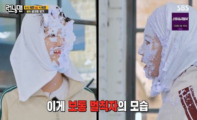 석진 대 석진 레이스 결과도 공개됐다. 진 팀의 패배로 팀원 전원의 벌칙이 확정된 가운데 진은 환승권을 이용해 벌칙을 면제 받았다. 이에 따라 지석진 유재석 송지효 전소민의 생크림 폭탄 벌칙이 성사됐다.